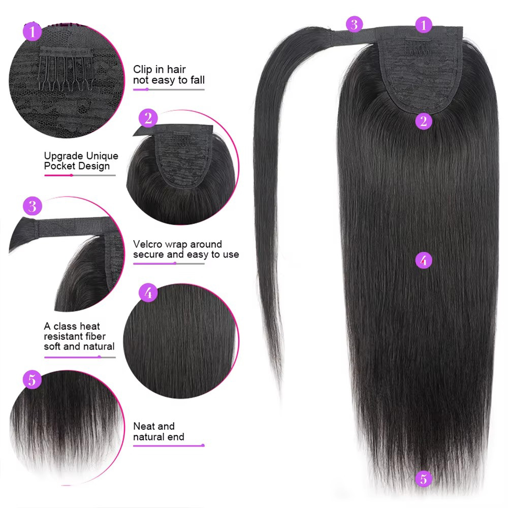 Achieve a sleek, flawless look in minutes with this Long Bone-Straight Wrap-Around Ponytail Clip-In, made from 100% Brazilian virgin human hair. Designed for a natural blend and secure fit, this ponytail delivers salon-quality smoothness, long-lasting wear, and versatile styling in a natural color that complements most hair tones.