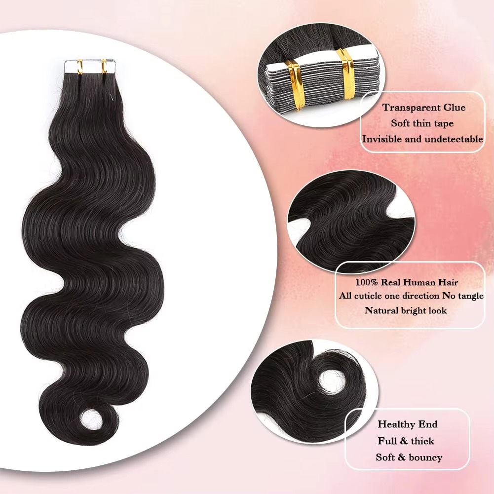 Upgrade your look with these PU Tape-In Human Hair Extensions. Made from 100% virgin human hair, these body wave extensions in natural black blend seamlessly for a fuller, longer, and naturally stunning style. Perfect for everyday wear or special occasions, these extensions are soft, durable, and reusable, giving you salon-quality results at home. Ideal for women who want effortless volume and length with a natural finish.