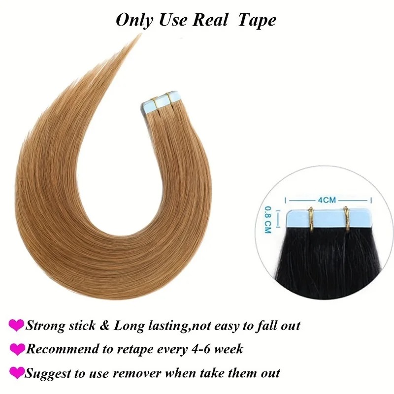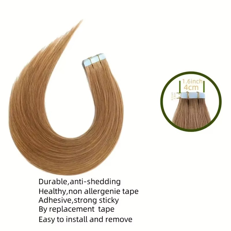 Upgrade your hairstyle with Straight #27 Strawberry Blonde Tape-In Human Hair Extensions for Women. Made from high-quality human hair, these 20pcs tape-in extensions blend seamlessly with your natural hair, delivering a smooth, natural look with easy application and long-lasting comfort.